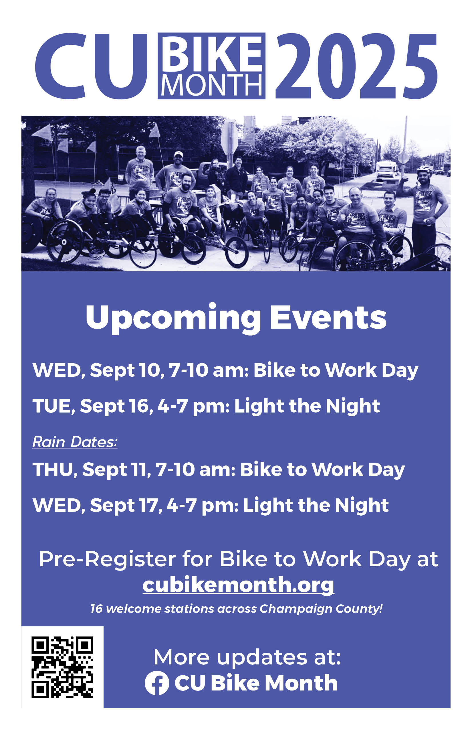 Associated Project(s):In a meeting on 6/13/2025 dates for the C-U Bike to Work Day and Light the Night events were finalized. Attached is a flyer showing the event dates. Registration will open later this summer at cubikemonth.org.